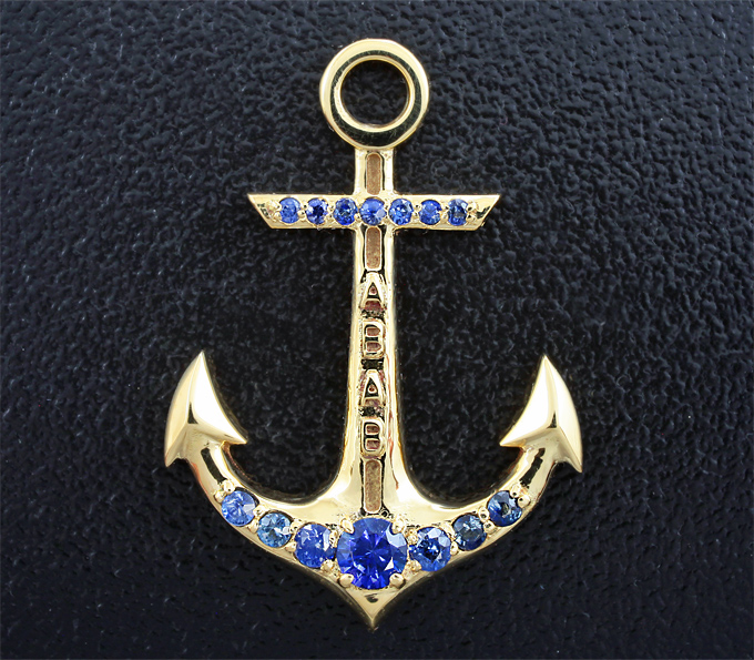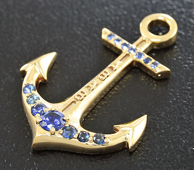 Вашему вниманию предлагается кулон «Якорь» из золота 750 пробы с синими сапфирами! Диаметр вставок от 1 мм до 3 мм. Площадка кулона 25 х 18 мм. Вес изделия 3 г.