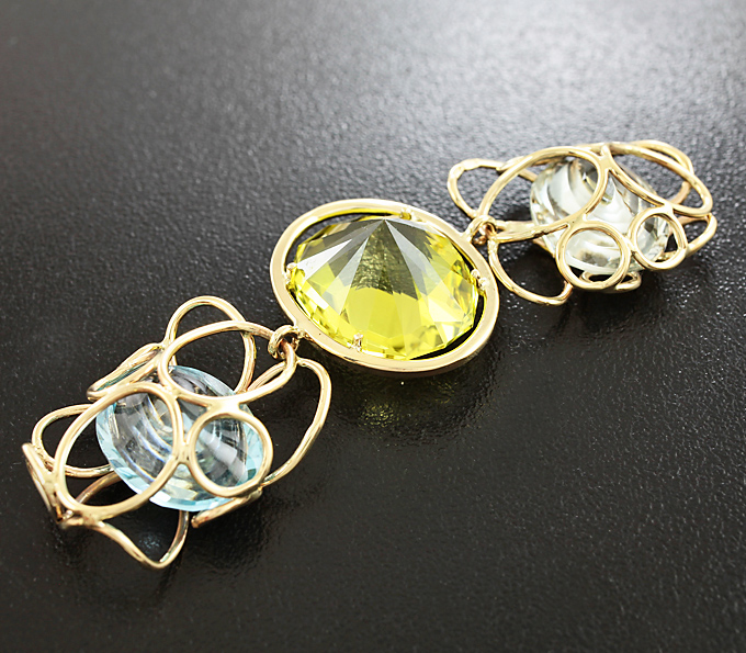 Вашему вниманию предлагается кулон из желтого золота 585 пробы с топазом, зеленым аметистом и лимонным кварцем авторской огранки! Размеры кулона с петлей 69 х 23 мм. Вес изделия 12,8 г. Ниже приводятся ювелирные характеристики вставок.