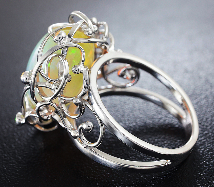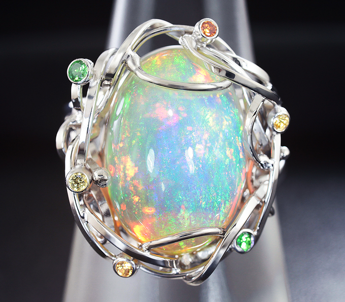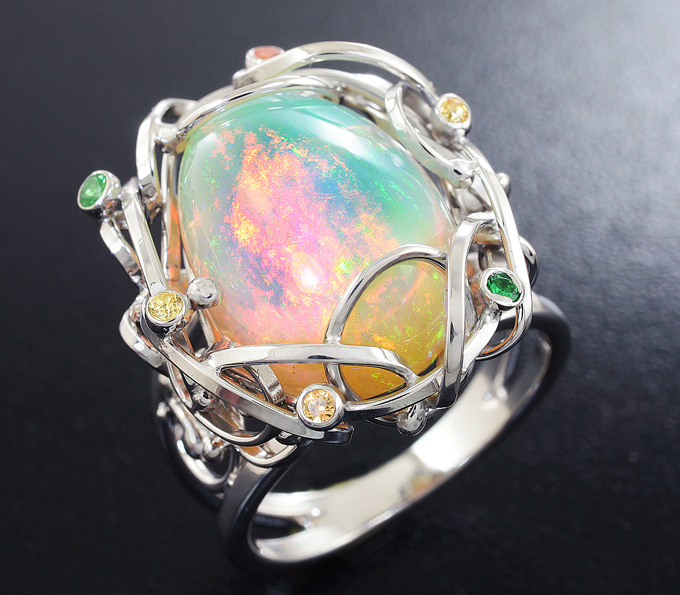 Кольцо c кристаллическим эфиопским опалом, сапфирами и цаворитами гранатами