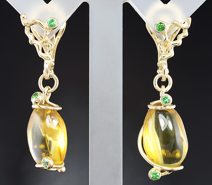 Вашему вниманию предлагаются серьги из желтого золота 585 пробы с доминиканским янтарем и цаворитами гранатами! Диаметр дополнительной инкрустации 2 мм. Размеры серег с петлей 38 х 10 мм. Вес пары 6,4 г. Ниже приводятся ювелирные характеристики янтаря.