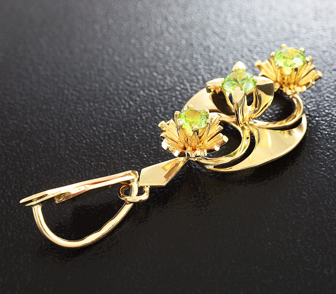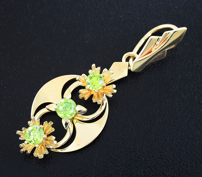 Вашему вниманию предлагается кулон из желтого золота 585 пробы с уральскими демантоидами! Размеры кулона с петлей 42 х 15 мм. Вес изделия 3,9 г. Ниже приводятся ювелирные характеристики вставок.