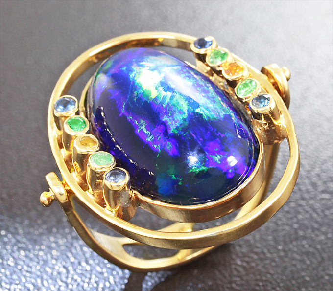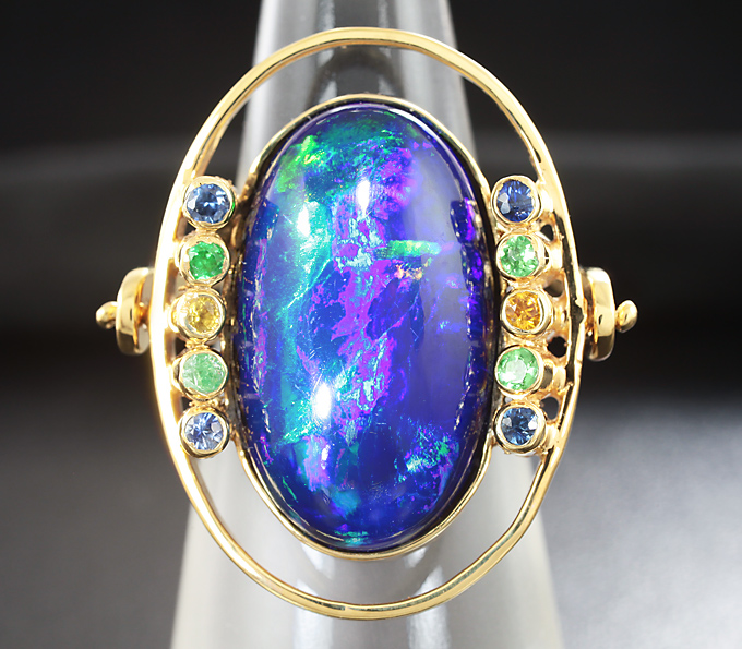Кольцо-трансформер с кристаллическим черным опалом, сапфирами и цаворитами гранатами