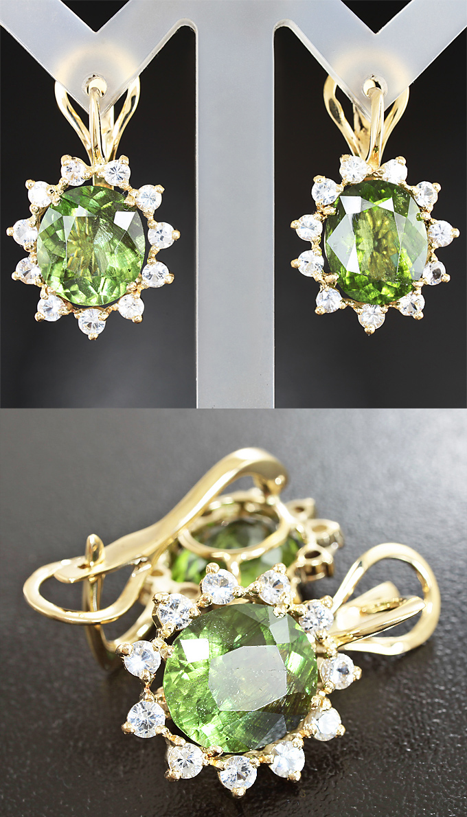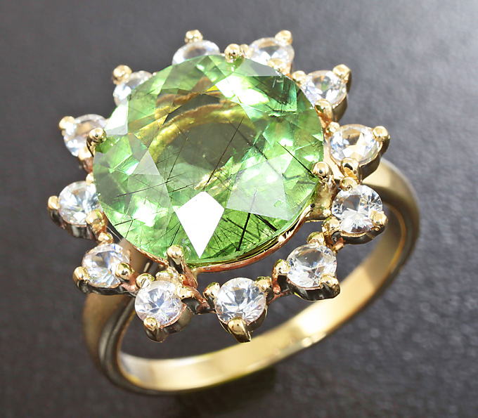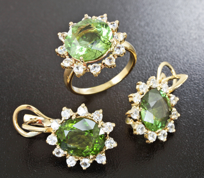 Вашему вниманию предлагается комплект (кольцо + серьги) из желтого золота 585 пробы с рутиловыми перидотами и бесцветными цирконами! Диаметр дополнительной инкрустации 2,5 мм. Вес комплекта 13,4 г.