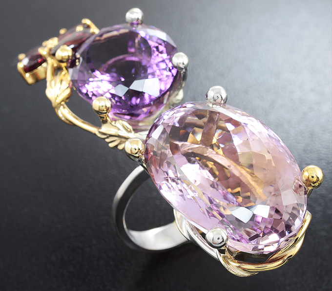 Кольцо c аметрином, насыщенным аметистом со сменой оттенка и родолитами гранатами