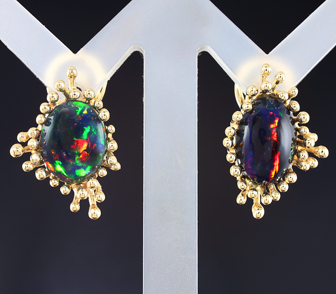 Вашему вниманию предлагаются серьги из желтого золота 585 пробы с кристаллическими черными опалами массой 4,1 карат! Основные цвета опалесценции: красный, желтый и зеленый. Размеры вставок 14 х 8 мм. Площадка серег 22 х 15 мм. Вес пары 6,6 г.