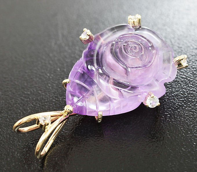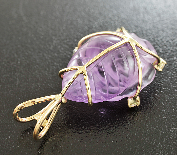Вашему вниманию предлагается кулон из желтого золота 585 пробы с резным аметистом и лейкосапфирами! Диаметр дополнительной инкрустации 2 мм. Размеры кулона с петлей 35 х 21 мм. Вес изделия 6,1 г. иже приводятся ювелирные характеристики аметиста.