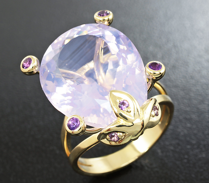 Вашему вниманию предлагается кольцо из желтого золота 585 пробы с лавандовым и фиолетовыми аметистами! Диаметр дополнительной инкрустации 1,5 мм и 2 мм. Площадка 22 х 17 мм, высота 12 мм. Вес изделия 7,2 г. Размер 17,25. Ниже приводятся ювелирные характеристики лавандового аметиста.