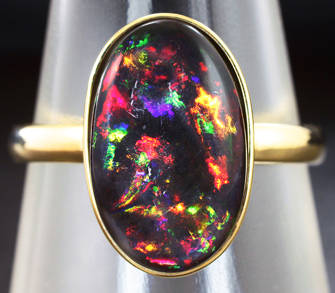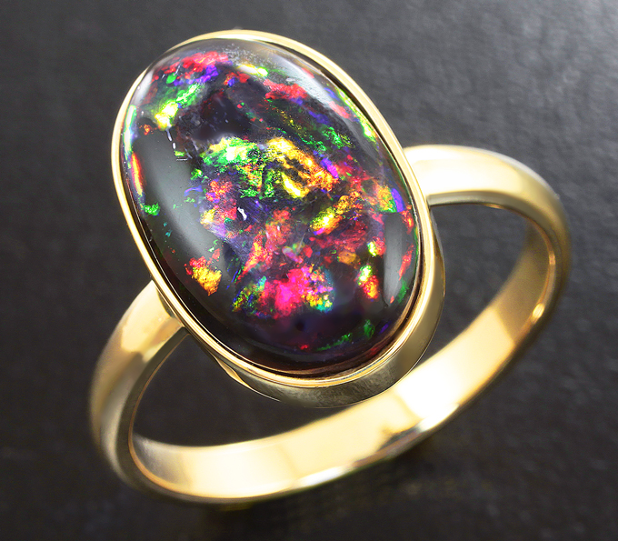 Вашему вниманию предлагается кольцо из желтого золота 585 пробы с кристаллическим черным опалом! Основные цвета опалесценции: красный, желтый и зеленый. Размеры вставки 15 х 9 мм. Площадка 16 х 10 мм, высота 5 мм. Вес изделия 3,26 г. Размер 18. Ниже приводятся ювелирные характеристики вставки.