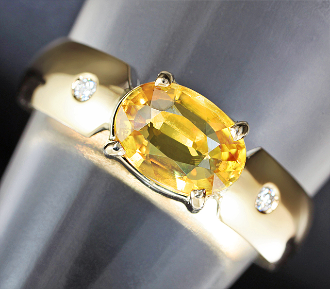 Вашему вниманию предлагается кольцо из желтого золота 585 пробы с золотисто-желтым сапфиром и бриллиантами! Диаметр дополнительной инкрустации 1,5 мм. Ширина площадки 6 мм, высота 4 мм. Вес изделия 3,1 г. Размер 18,5. Ниже приводятся ювелирные характеристики сапфира.