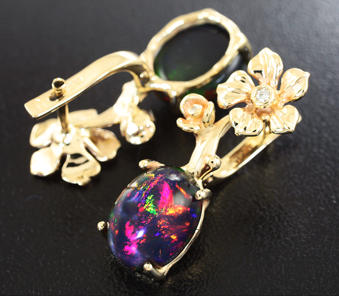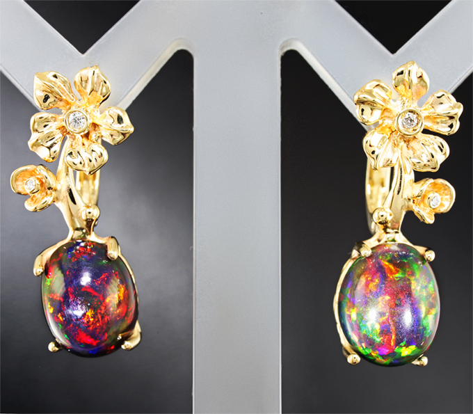 Вашему вниманию предлагаются серьги из желтого золота 585 пробы с кристаллическими черными опалами и бриллиантами! Основные цвета опалесценции: красный, желтый и зеленый. Диаметр дополнительной инкрустации 1 мм и 1,5 мм. Площадка серег 27 х 10 мм. Вес пары 5,7 г. Ниже приводятся ювелирные характеристики опалов.