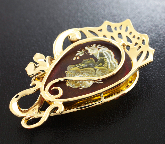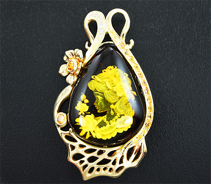 Кулон с резным янтарем 11,1 карат, сапфирами и бриллиантами