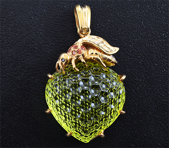 Кулон с крупным цитрином авторской огранки, ярко-оранжевыми сапфирами и черными шпинелями