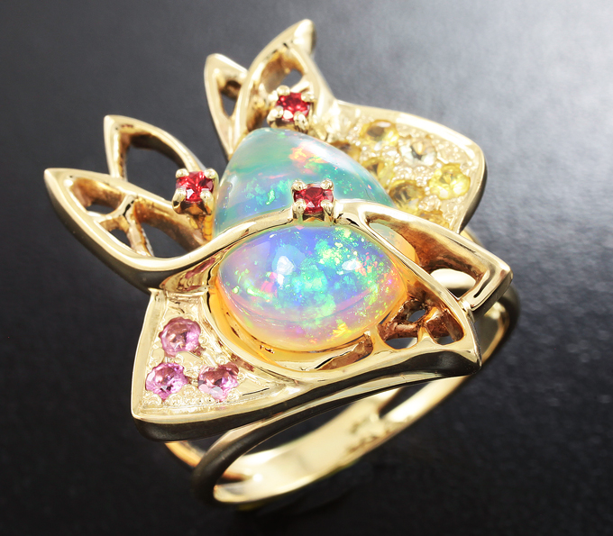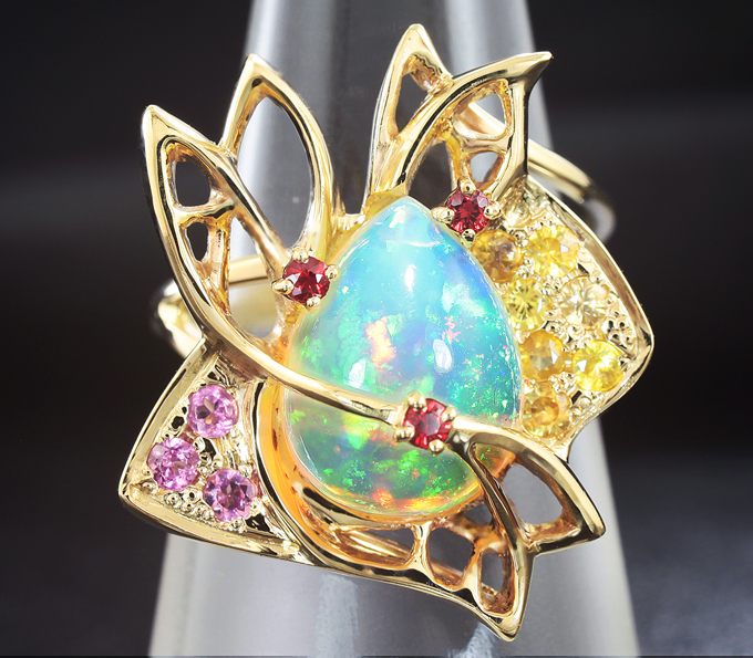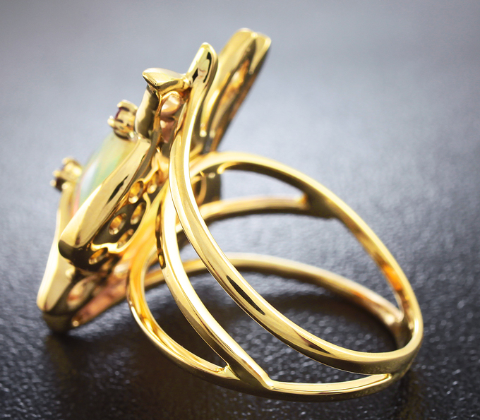 Кольцо с кристаллическим эфиопским опалом, мозамбикскими гранатами. цитринами и розовыми сапфирами