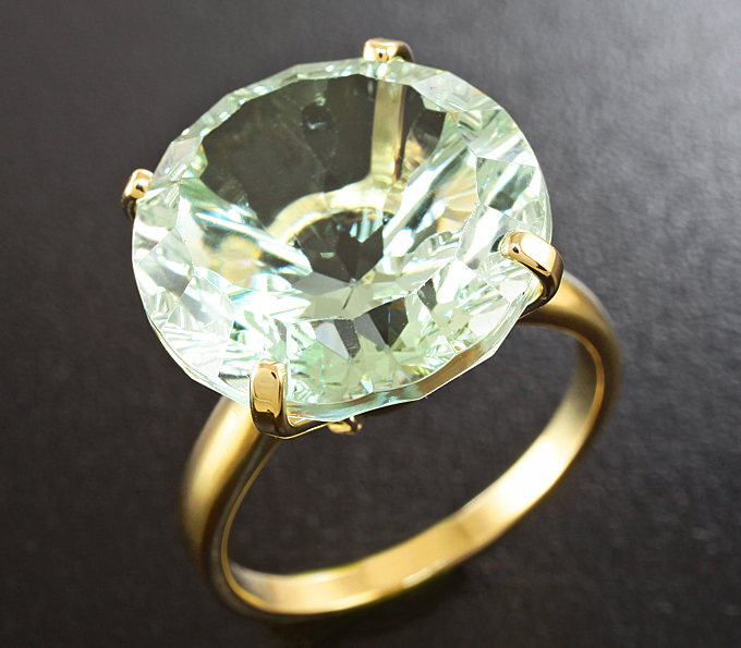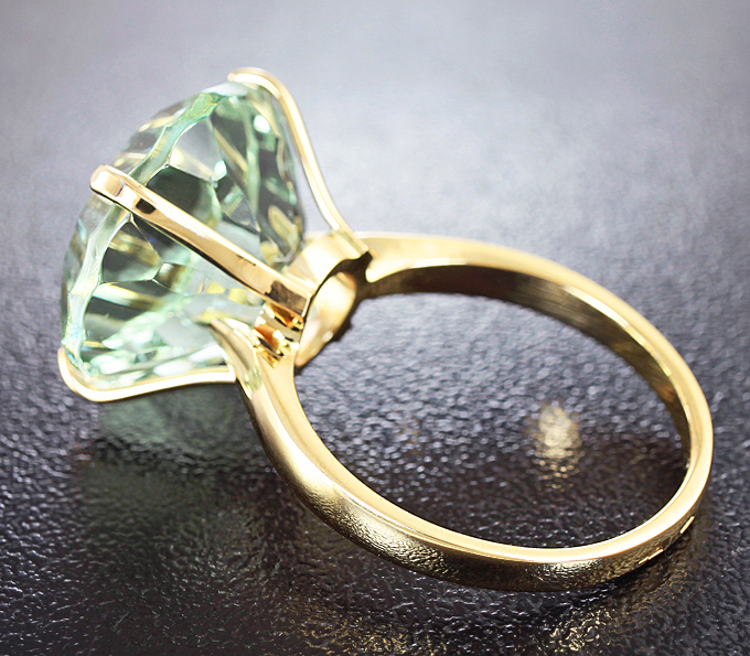 Вашему вниманию предлагается кольцо из желтого золота 585 пробы с зеленым аметистом авторской огранки! Диаметр площадки 16 мм, высота 11 мм. Вес изделия 6,1 г. Размер 18,5. Ниже приводятся ювелирные характеристик вставки.