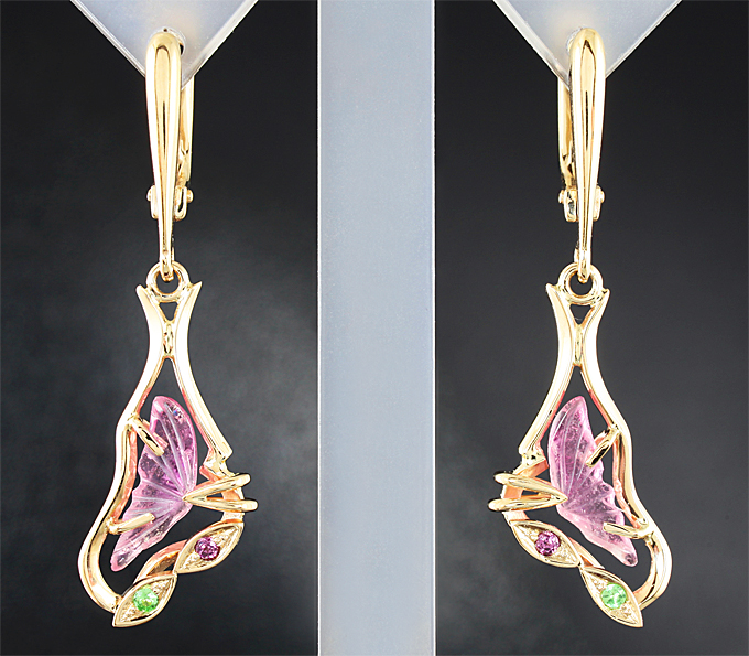 Серьги с резными и ограненными рубеллитами, а также цаворитами гранатами