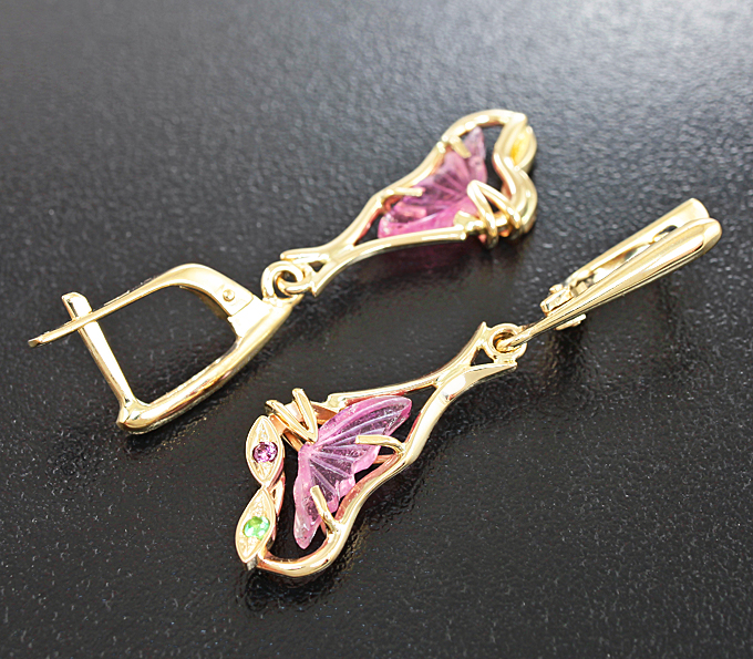 Вашему вниманию предлагаются серьги из желтого золота 585 пробы с резными и ограненными рубеллитами, а также цаворитами гранатами! Диаметр дополнительной инкрустации 1,5 мм. Размеры серег с петлей 40 х 12 мм. Вес пары 5,2 г. Ниже приводятся ювелирные характеристики резных турмалинов.