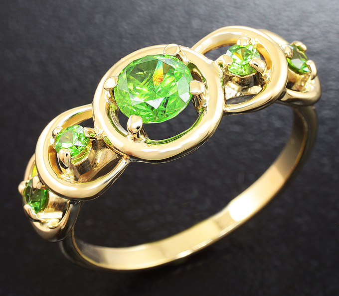Вашему вниманию предлагается кольцо из желтого золота 585 пробы с демантоидами гранатами! Диаметр вставок 2,65 мм и 5,5 мм. Площадка 24 х 9 мм, высота 4 мм. Вес изделия 4,5 г. Размер 19,5.