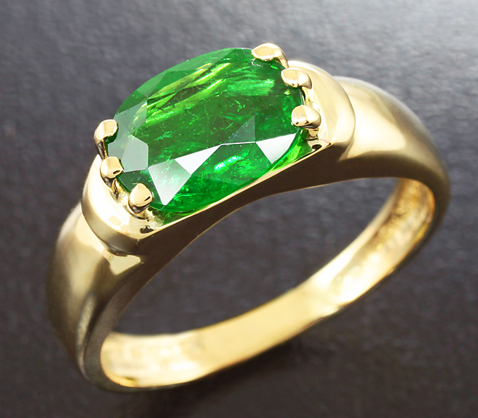 Вашему вниманию предлагается кольцо из желтого золота 585 пробы с цаворитом гранатом! Площадка 10 х 7 мм, высота 6 мм. Вес изделия 3,6 г. Размер 17. Ниже приводятся ювелирные характеристики.