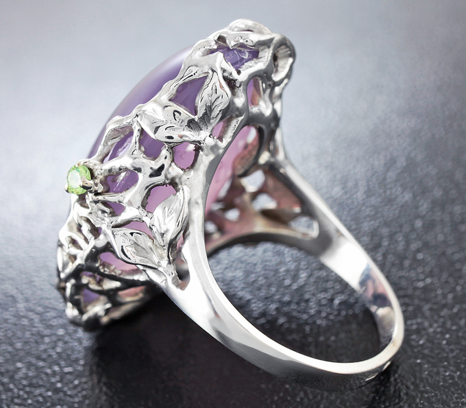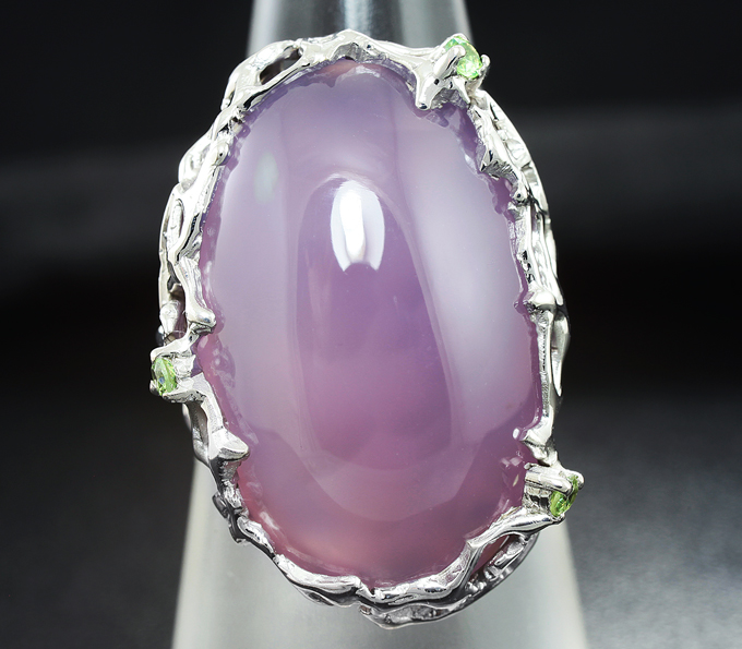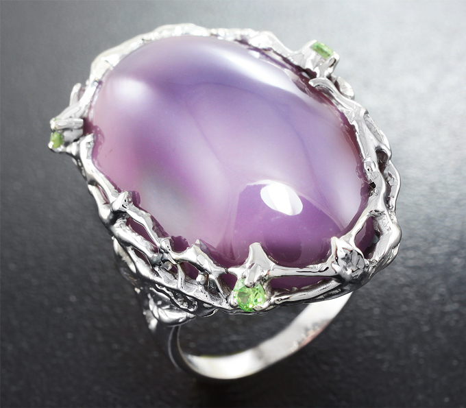 Вашему вниманию предлагается кольцо из стерлингового серебра (925 проба) c лавандовым халцедоном и демантоидами гранатами! Диаметр дополнительной инкрустации 2 мм. Площадка 28 х 20 мм, высота 10 мм. Вес изделия 10,3 г. Размер 17. Ниже приводятся ювелирные характеристики халцедона.