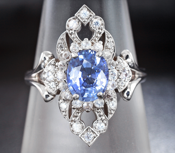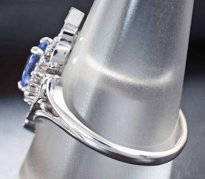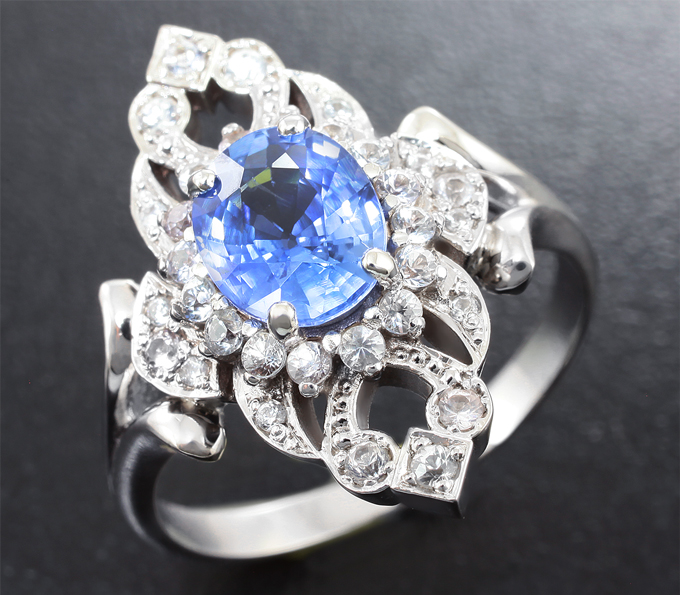 Вашему вниманию предлагается кольцо из белого золота 585 пробы c синим сапфиром и бесцветными цирконами! Диаметр дополнителньой инкрустации от 1 мм до 1,5 мм. Площадка 22 х 14 мм, высота 5 мм. Вес изделия 6 г. Размер 18,5. Ниже приводятся ювелирные характеристики сапфира.