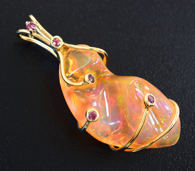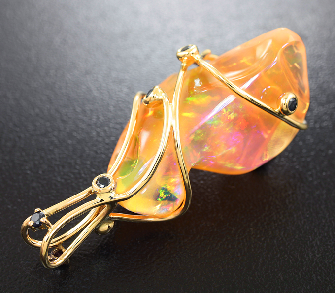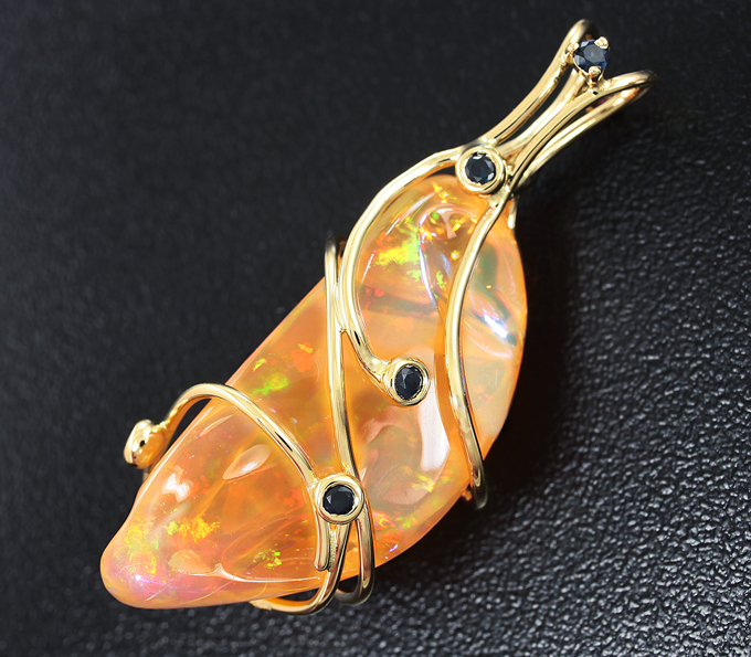 Кулон с мексиканским опалом, синими и красными сапфирами