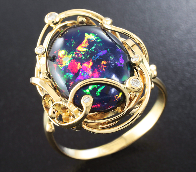 Вашему вниманию предлагается кольцо из желтого золота 585 пробы с кристаллическим черным опалом и 6 бриллиантами! Диаметр дополнительной инкрустации 1 мм и 1,5 мм. Площадка 23 х 18 мм, высота 9 мм. Вес изделия 5,9 г. Размер 19,5. Ниже приводятся ювелирные характеристики опала.