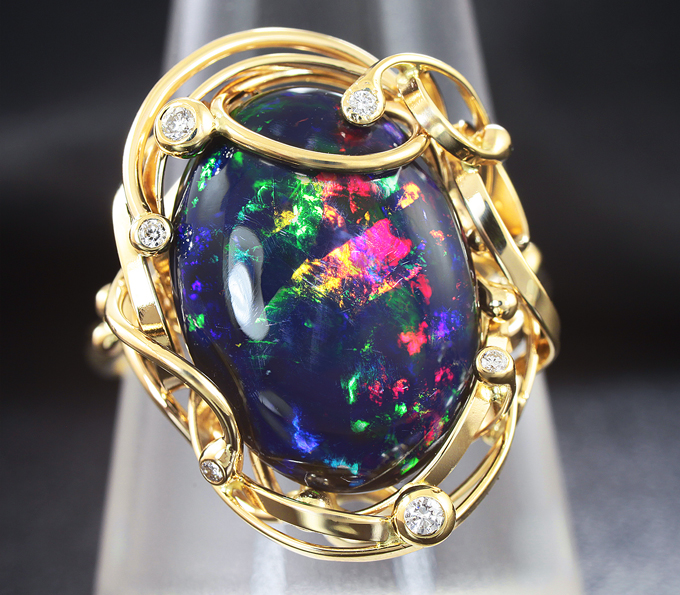 Кольцо с кристаллическим черным опалом и бриллиантами