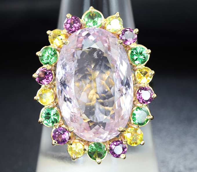 Вашему вниманию предлагается кольцо из желтого золота 585 пробы с крупным морганитом, желтыми сапфирами, родолитами и цаворитами гранатами! Диаметр дополнительной инкрустации 3 мм. Площадка 27 х 21 мм, высота 9 мм. Вес изделия 9,32 г. Размер 19,5. Ниже приводятся ювелирные характеристики морганита.