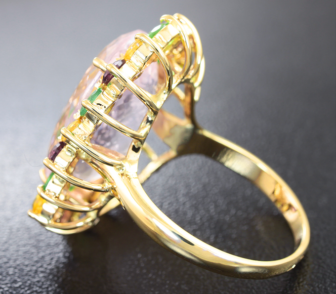 Золотое кольцо с крупным морганитом, желтыми сапфирами, родолитами и цаворитами