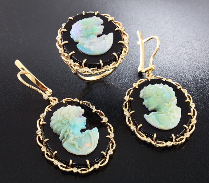 Комплект с камеями из оникса с резными опалами топового качества и бриллиантами