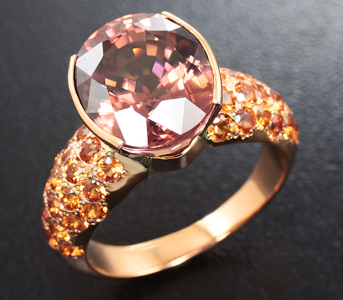 Вашему вниманию предлагается кольцо из розового золота 585 пробы с крупным оранжевым цирконом и сапфирами! Диаметр дополнительной инкрустации 2 мм. Площадка 21 х 12 мм, высота 8 мм. Вес изделия 5,96 г. Размер 17. Ниже приводятся ювелирные характеристики циркона.