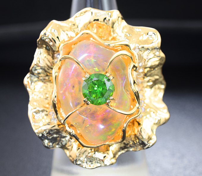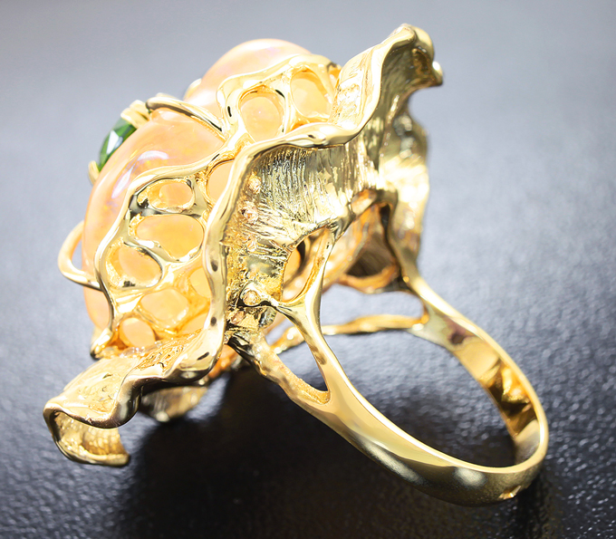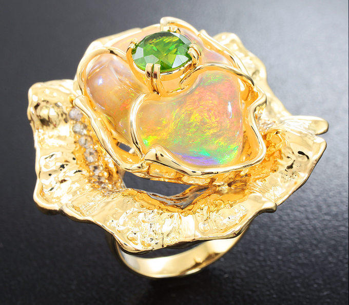 Кольцо с кристаллическим эфиопским опалом, демантоидом гранатом и лейкосапфирами