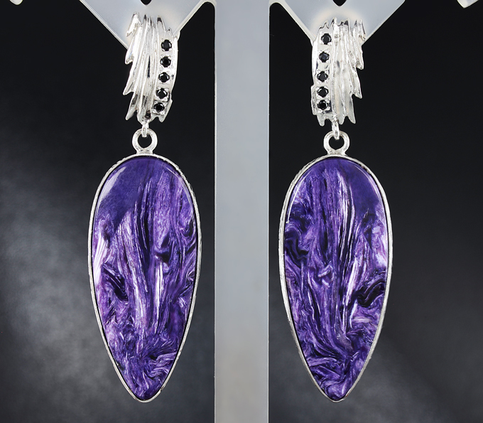 Вашему вниманию предлагаются серьги из стерлингового серебра (925 проба) с чароитами топового качества и черными шпинелями! Диаметр дополнительной инкрустации 1,5 мм. Размеры серег с петлей 57 х 17 мм. Вес пары 11,7 г. Ниже приводятся ювелирные характеристики чароитов.