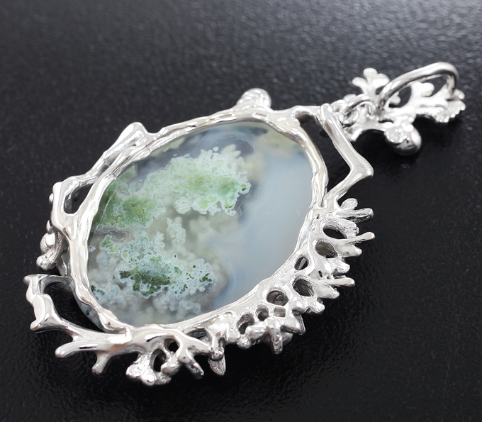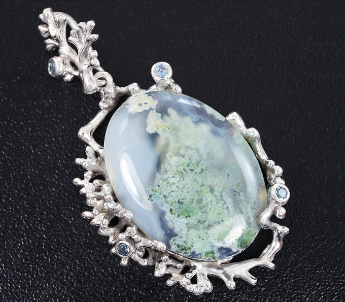 Вашему вниманию предлагается кулон из стерлингового серебра (925 проба) с дендритическим агатом и голубыми сапфирами! Диаметр дополнительной инкрустации 2 мм. Размеры кулона с петлей 48 х 26 мм. Вес изделия 8,9 г. Ниже приводятся ювелирные характеристики агата.
