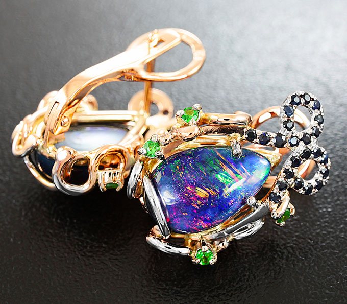 Вашему вниманию предлагаются серьги из желтого и белого золота 585 пробы с кристаллическими черными опалами, синими сапфирами и цаворитами гранатами! Диаметр дополнительной инкрустации от 1 мм до 2 мм. Площадка серег 22 х 16 мм. Вес пары 8 г. Ниже приводятся ювелирные характеристики опалов.