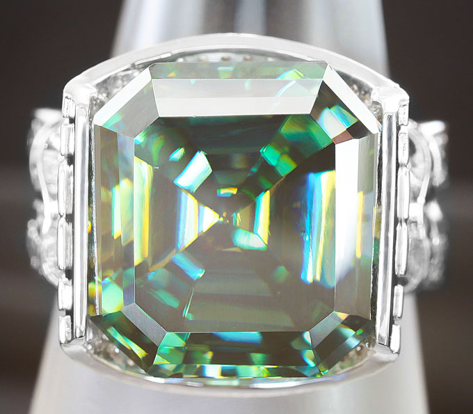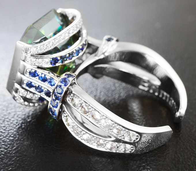 Кольцо с муассанитом эксклюзивного размера, бриллиантами, голубыми и бесцветными сапфирами