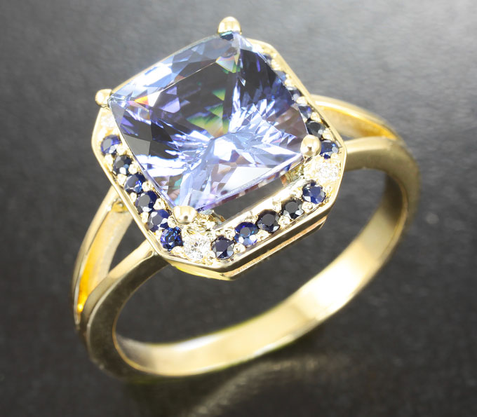 Вашему вниманию предлагается кольцо из желтого золота 585 пробы с чистейшим танзанитом, синими сапфирами и 4 бриллиантами! Диаметр дополнительной инкрустации 1 мм и 1,1 мм. Площадка 13 х 11 мм, высота 6 мм. Вес изделия 4,5 г. Размер 17. Ниже приводятся ювелирные характеристики танзанита.