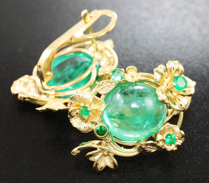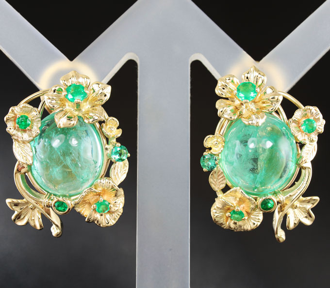 Вашему вниманию предлагаются серьги из желтого золота 585 пробы с уральскими и колумбийскими изумрудами! Диаметр дополнительной инкрустации 2,5 мм и 3 мм. Площадка серег 27 х 19 мм. Вес пары 11,7 г. Ниже приводятся ювелирные характеристики кабошонов.