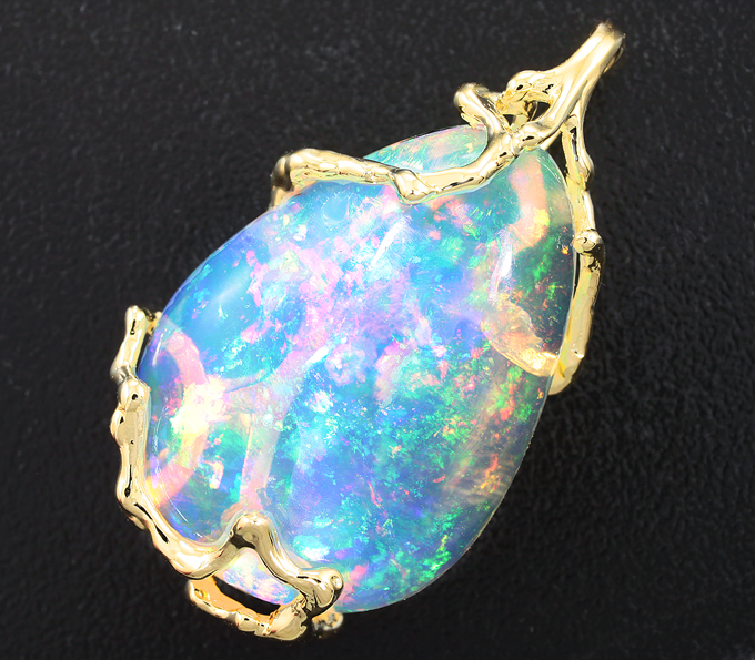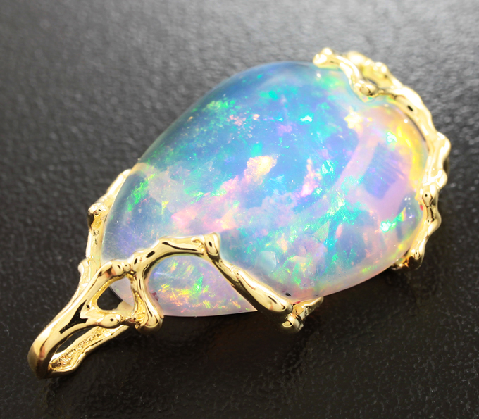Вашему вниманию предлагается кулон из желтого золота 585 пробы с кристаллическим эфиопским опалом! Основные цвета опалесценции: красный, желтый, зеленый и синий. Пощадка кулона 35 х 22 мм. Вес изделия 7,5 г.Ниже приводятся ювелирные характеристики вставки.