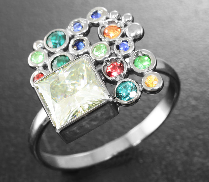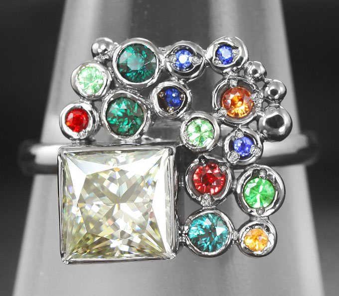 Кольцо c муассанитом, цаворитами гранатами и разноцветными сапфирами