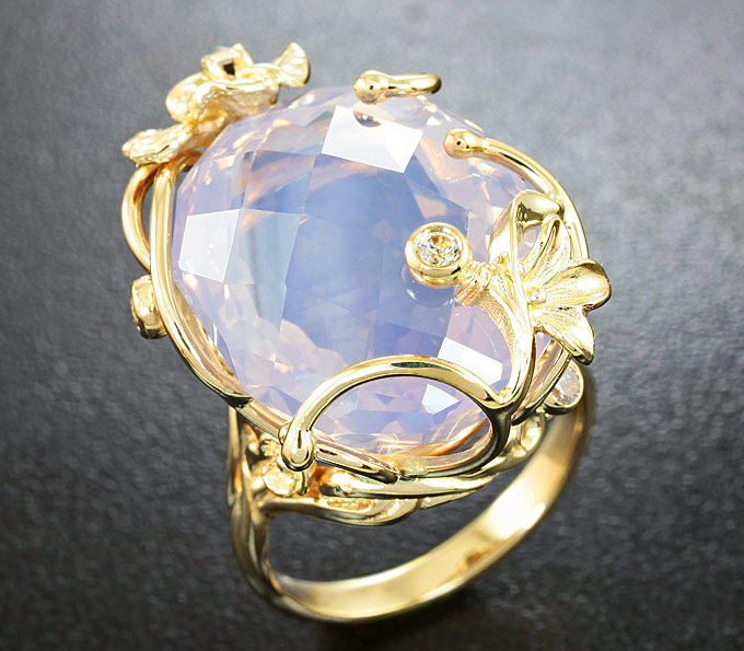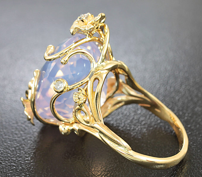 Вашему вниманию предлагается кольцо из желтого золота 585 пробы с лавандовым аметистом и лейкосапфирами! Размеры вставки 20 х 17 мм. Площадка 27 х 19 мм, высота 15 мм. Вес изделия 13,2 г. Размер 18.