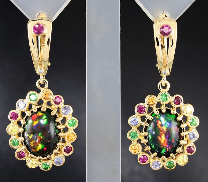 Вашему вниманию предлагаются серьги из желтого золота 585 пробы с кристаллическими черными опалами, танзанитами, цаворитами гранатами, рубинами, сапфирами и 2 бриллиантами! Основные цвета опалесценции: красный, желтый и зеленый. Размеры серег с петлей 35 х 16 мм. Вес пары 10,3 г. Ниже приводятся ювелирные характеристики опалов.
