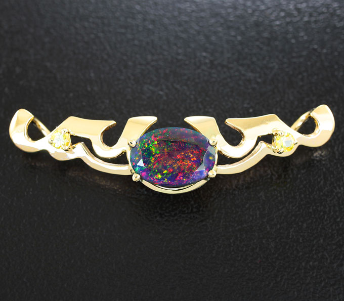 Вашему вниманию предлагается кулон из желтого золота 585 пробы с ограненным черным опалом 1,01 карат и желтовато-белыми сапфирами! Диаметр дополнительной инкрустации 2 мм Площадка кулона 38 х 11 мм. Вес изделия 2 г. Ниже приводятся ювелирные характеристики опала.