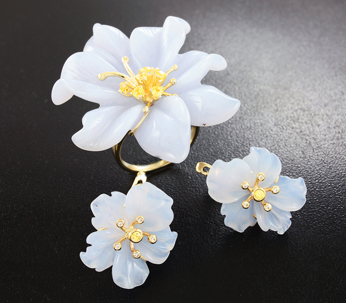 Вашему вниманию предлагается комплект (кольцо + серьги) из желтого золота 585 пробы с резным халцедоном 56,46 карат и желтыми сапфирами! Диаметр вставок 1 мм и 2,5 мм. Вес комплекта 19,2 г.
