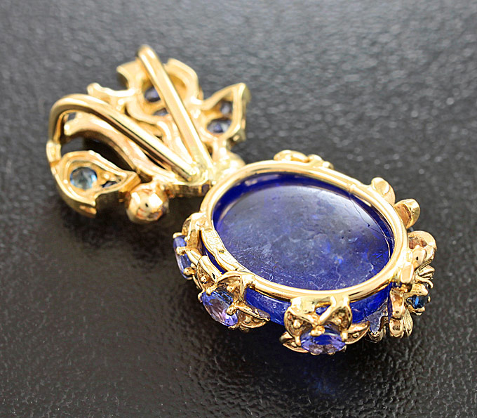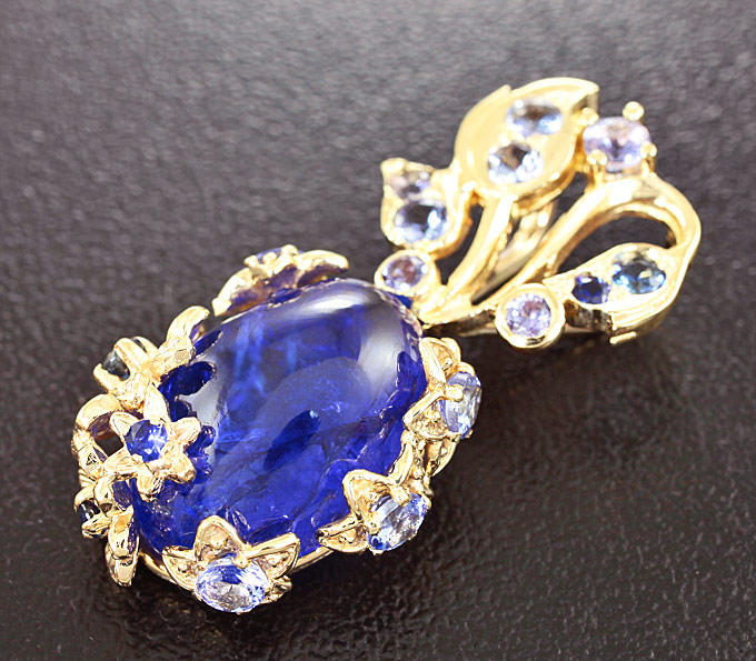 Вашему вниманию предлагается кулон из желтого золота 585 пробы с кабошоном танзанита массой 8,85 карат, ограненными танзанитами, синими сапфирами и бриллиантами! Размеры кабошона 15 х 11 мм, диаметр дополнительной инкрустации от 1 мм до 3 мм. Площадка кулона 31 х 14 мм. Вес изделия 5,7 г.