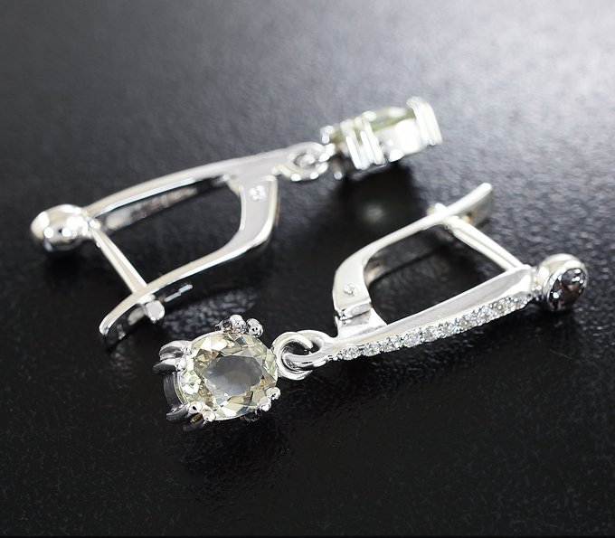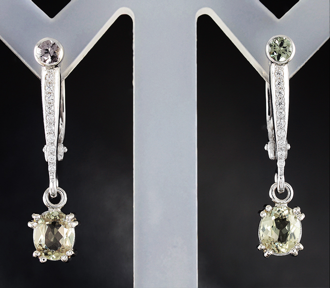 Вашему вниманию предлагаются серьги из белого золота 585 пробы с гранатами со сменой цвета, диаспорами и бесцветными сапфирами! Диаметр дополнительной инкрустации 1 мм. Размеры серег с петлей 27 х 6 мм. Вес пары 3,5 г. Ниже приводятся ювелирные характеристики гранатов и диаспоров.