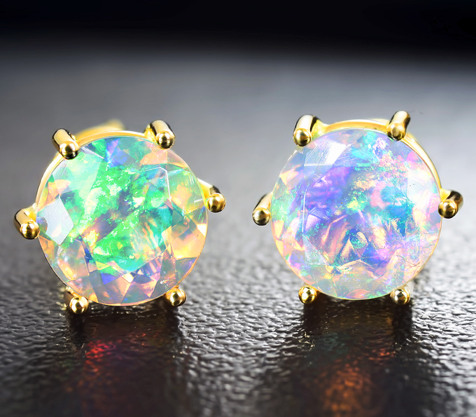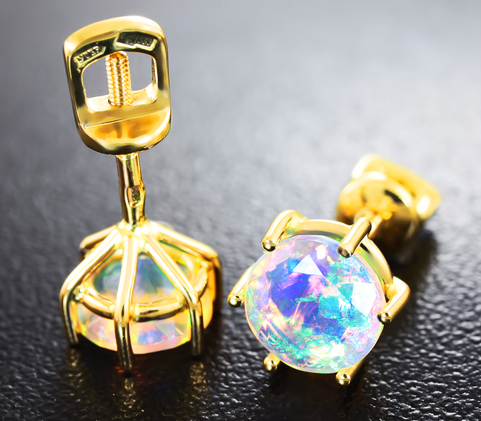 Вашему вниманию предлагаются пусеты из желтого золота 585 пробы с ограненными эфиопскими опалами массой 1,67 карат! Основные цвета опалесценции: зеленый, синий и фиолетовый. Диаметр вставок 7 мм. Площадка пусет 9 х 8 мм. Вес пары 2,6 г.
