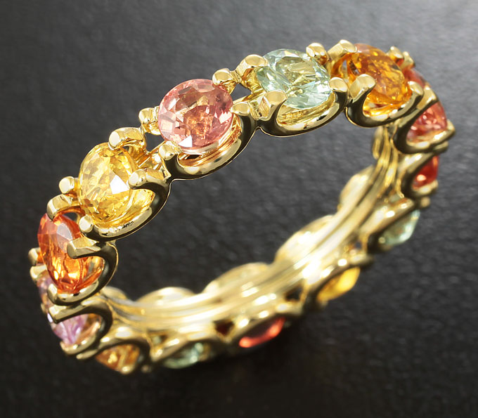 Вашему вниманию предлагается кольцо из желтого золота 750 пробы с разноцветными сапфирами! Диаметр вставок 4 мм. Ширина площадка 4 мм, высота 3 мм. Вес изделия 4,4 г. Размер 17,5. Ниже приводятся ювелирные характеристики вставок.