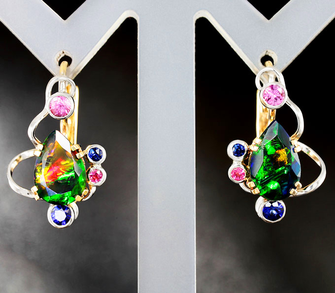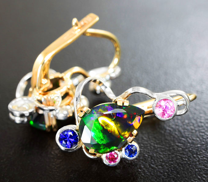 Серьги с ограненными черными опалами, синими и розовыми сапфирами
