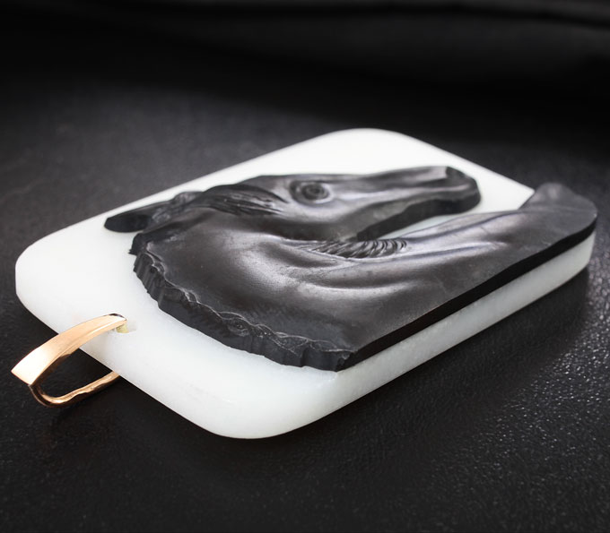 Камея-подвеска «Вороной» с цельной черной яшмы на белом жадеите